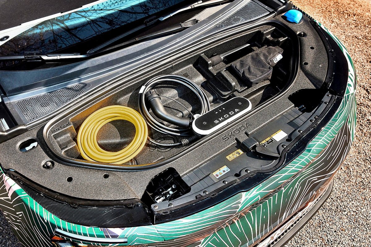 37-litrowy frunk (przedni bagażnik) – w sam raz na przybory do ładowania. Wyściółka z recyklingu. / fot. Skoda