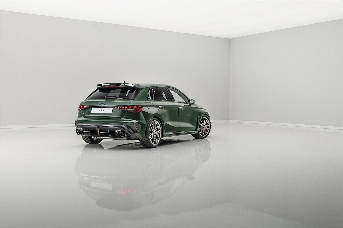 Z zewnątrz sportowy kompakt otrzymał ciemny zielony lakier Malachite Green i historyczne logo Audi Sport. Zaskakuje sekwencja świateł 1-2-4-5-3, przy odblokowywaniu/blokowaniu zamków, nawiązująca do kolejności zapłonu w 5-cylindrowym silniku.