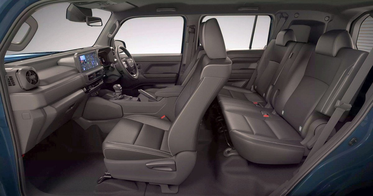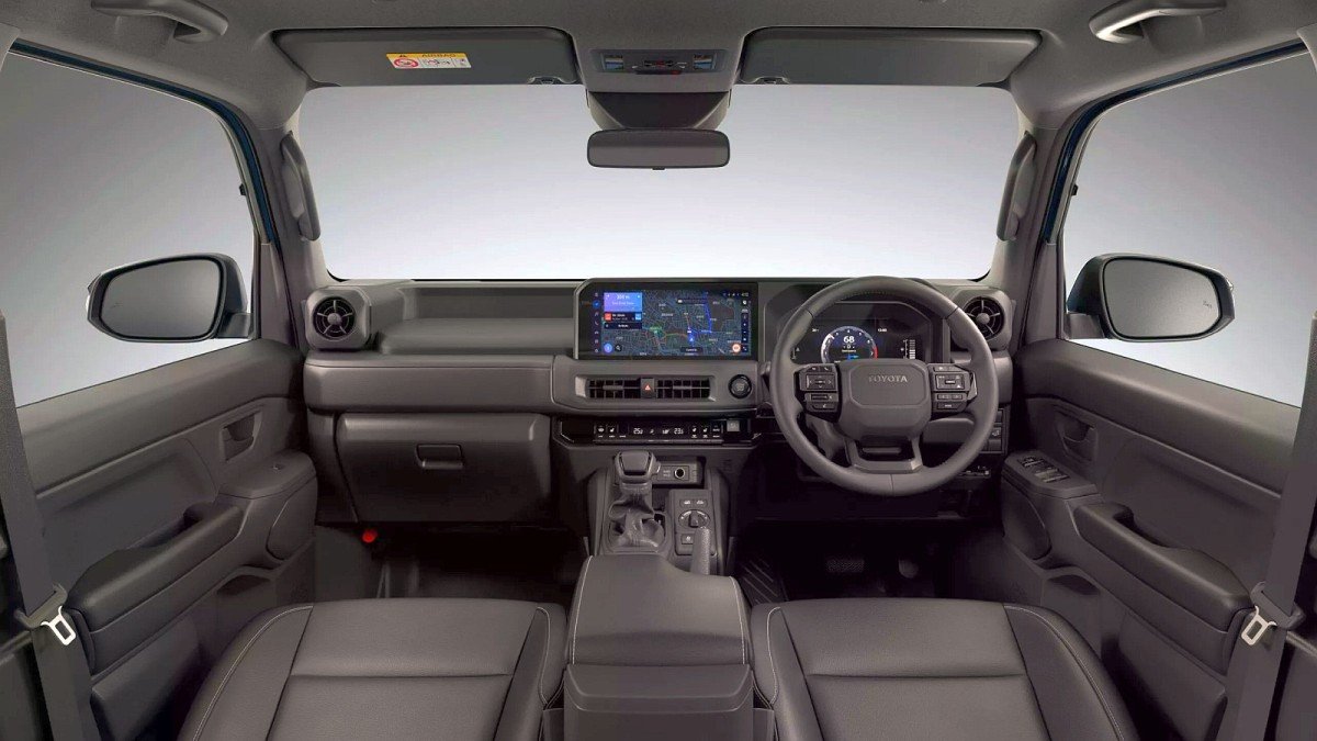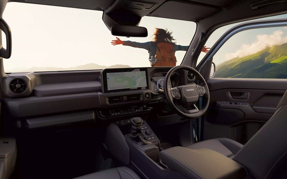 Kabina Land Cruisera FJ łączy klasyczny, użytkowy charakter z nowoczesną technologią. Znajdziemy tu masywną kierownicę, cyfrowy zestaw wskaźników oraz ekran multimedialny o przekątnej 12,5 cala.