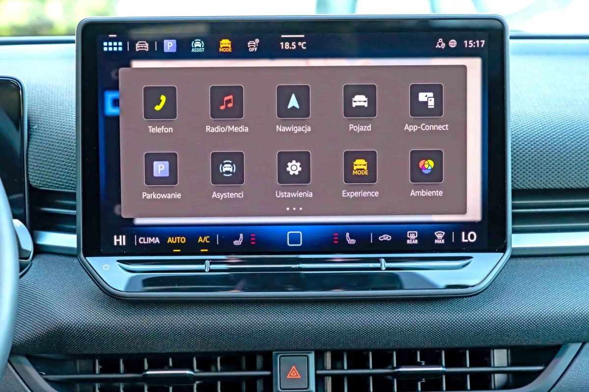 Jeśli chodzi o obsługę, to zgodnie z trendami dominuje ta dotykowa. Nie jest to najgorsza wiadomość, bo system Volkswagena jest stosunkowo przyjazny w obsłudze. Na kierownicy zastosowano na szczęście tradycyjne przyciski, które są znacznie lepszym rozwiązaniem niż dotykowe pola, z którymi eksperymentuje VW. Jest jeszcze dwufunkcyjne pokrętło, służące do regulacji głośności lub trybu jazdy. Tuż obok znalazła się ładowarka indukcyjna do smartfonów.